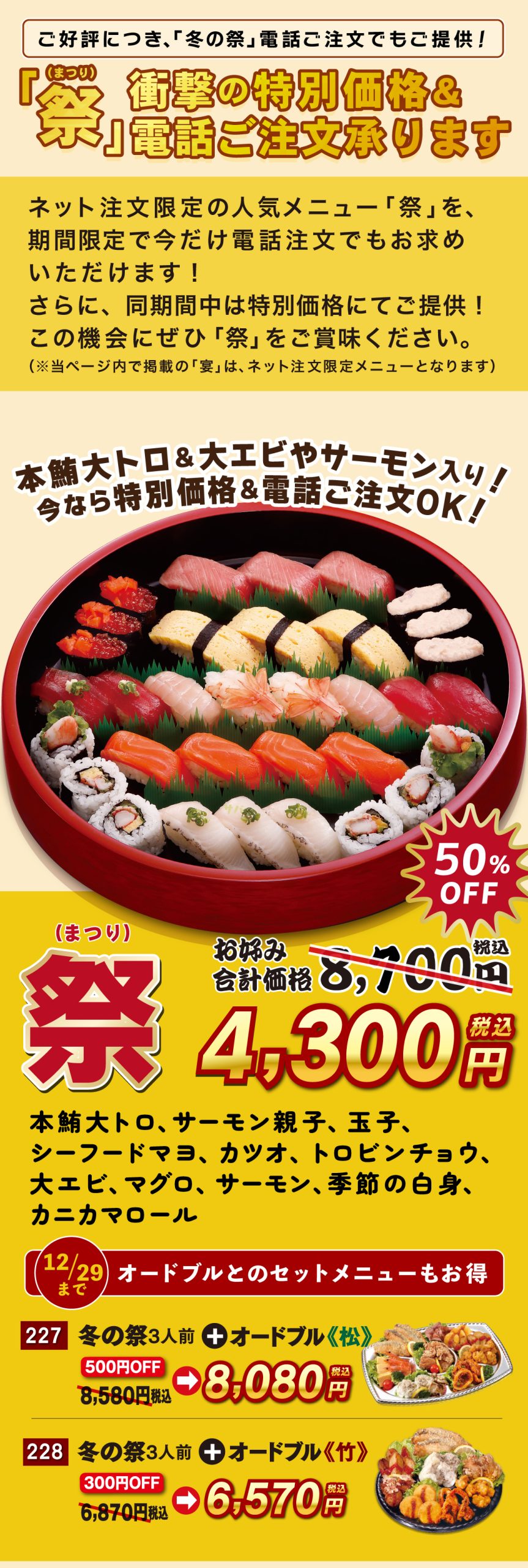 通常ネット販売限定メニューですが、ご好評につき12/29まで「祭(まつり)」の電話ご注文承りを継続します!